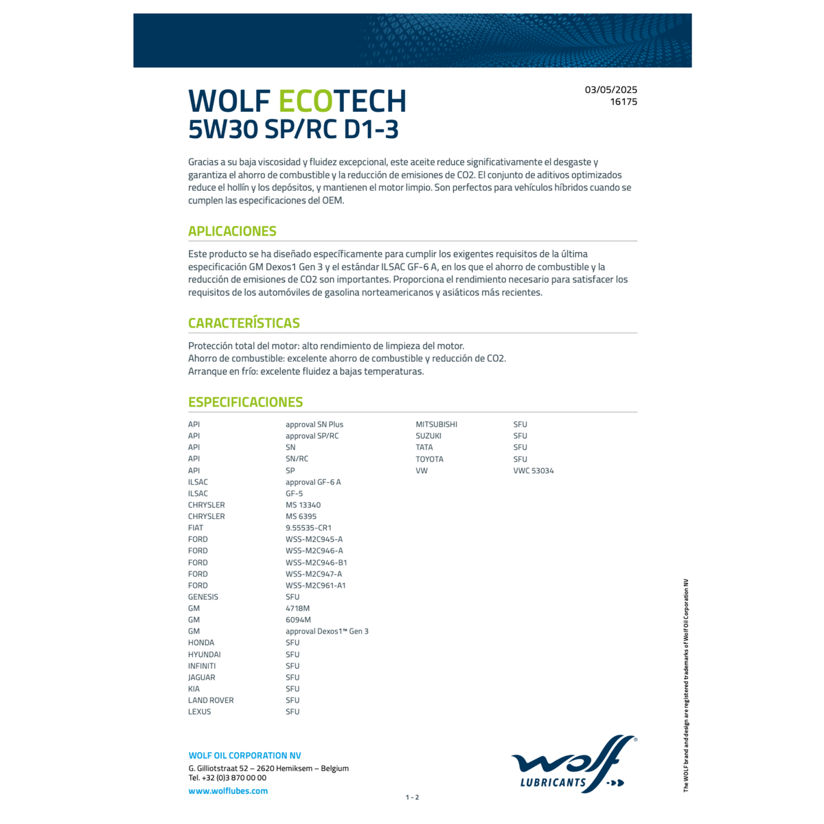 El Wolf EcoTech 5W30 SP / RC D1-3 es un lubricante 100% sintético de última generación, diseñado para superar los requisitos de la norma GM Dexos1™ Gen 3. Su fórmula de baja viscosidad y alta fluidez es la respuesta definitiva para motores turbo de inyección directa que exigen la máxima eficiencia y protección contra el pre-encendido (LSPI).